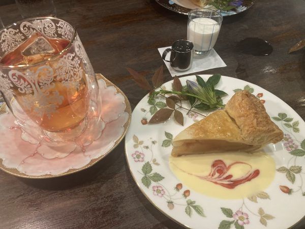 素敵なグラスに入って来たアイスティと、アップルパイもおしゃれですね〜。