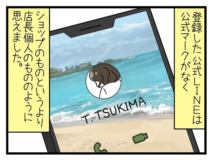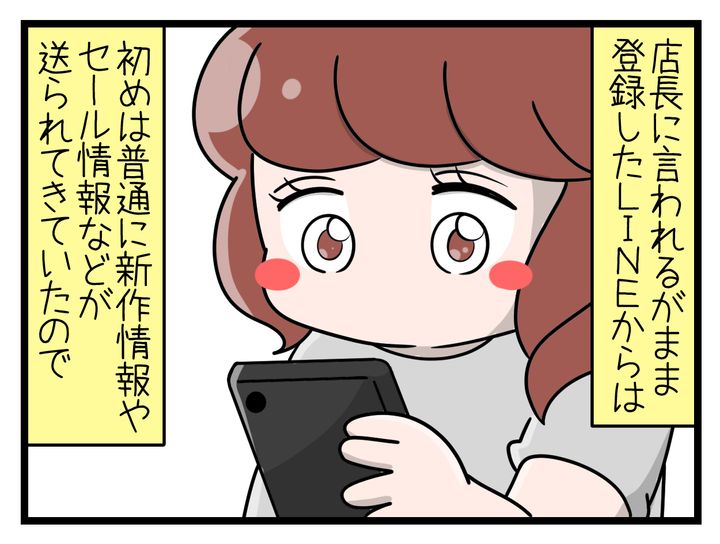 公式SNSに登録したはずが、店長個人のSNSのような雰囲気。いちこは違和感を感じながらも、お店の新作情報やお得情報が淡々と送られてくるようになり、「本当にお店のLINEなんだ」と不信感も薄れていって…。