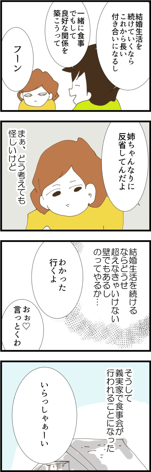 夫は義姉の言葉を鵜呑みにし、姉ちゃんなりに反省してると考えている様子。しかし妻はこの食事会を怪しいと感じていました。