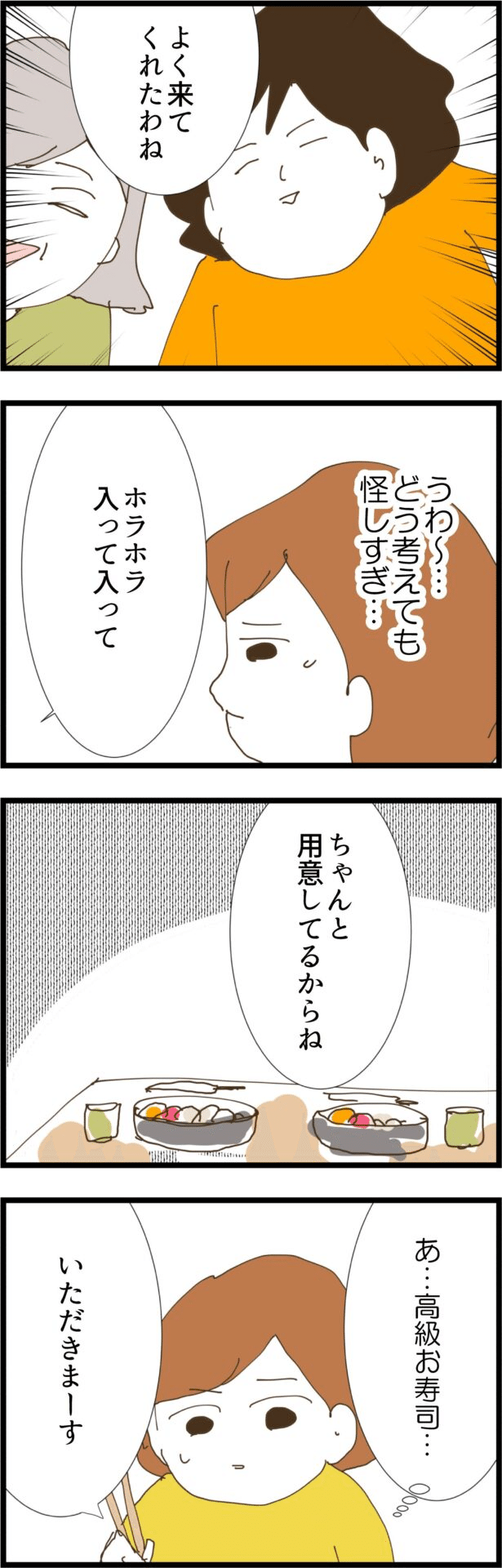 食事会当日、満面の笑みで出迎える義母と義姉に、やっぱり怪しさを感じつつ、食事をいただくことにしましたが…。