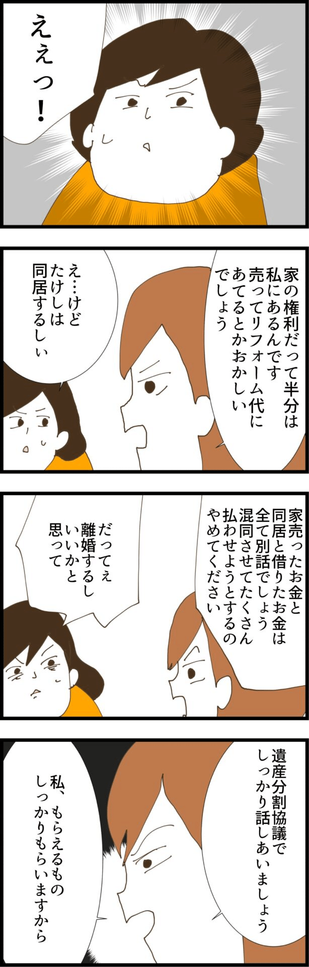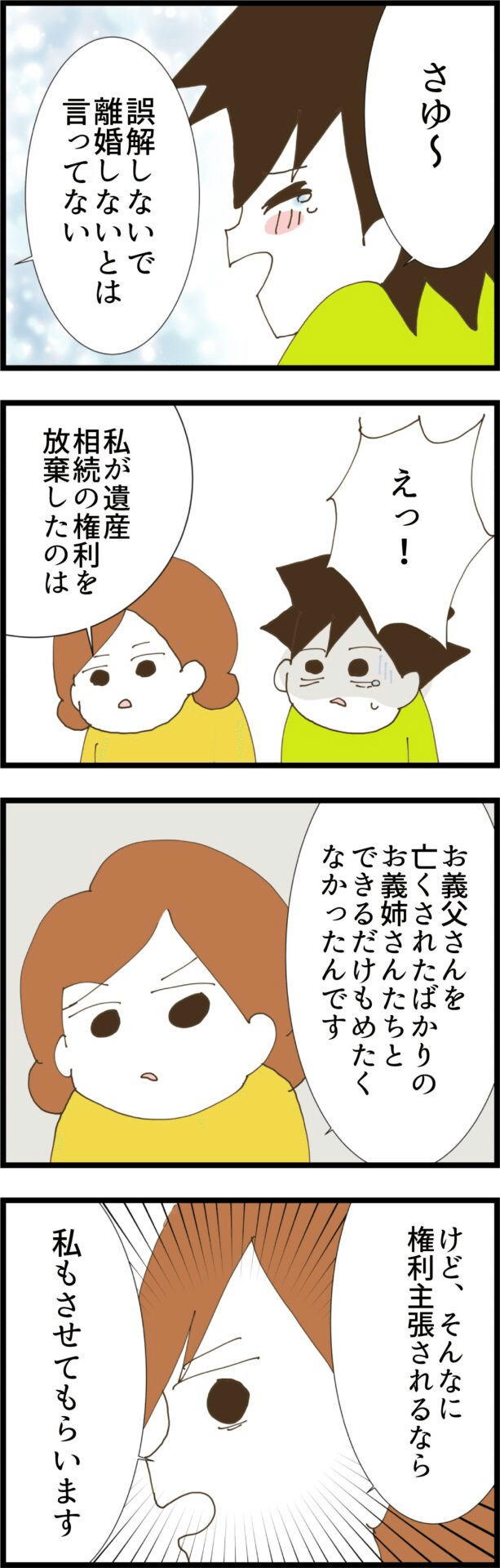 時代錯誤な義実家に悩まされていた主人公・さゆは、毎週の食事会に参加しないことにしました。幼馴染のかおりが義実家に通うようになり、夫に隠されていたことで妻は離婚を宣言します。数ヶ月後、義父が他界し、妻に遺産相続の権利があることが判明。義姉に言われるがまま相続放棄した妻でしたが、その後義姉に義父から援助された500万円を返せと言われてしまいます。婚姻中は義実家に最大限の気配りをしてきたという義姉でしたが、結果夫に裏切られ離婚。被害者の自分が苦労しているなんておかしいと言いますが、それは夫に依存してきた結果だと妻が指摘。逆ギレする義姉を見て、突然大金を手にして正常な判断ができないのだと考えた妻は、離婚を保留にすること、遺産相続を放棄しないこと、家を売らないことを決断し、義姉に伝えました。