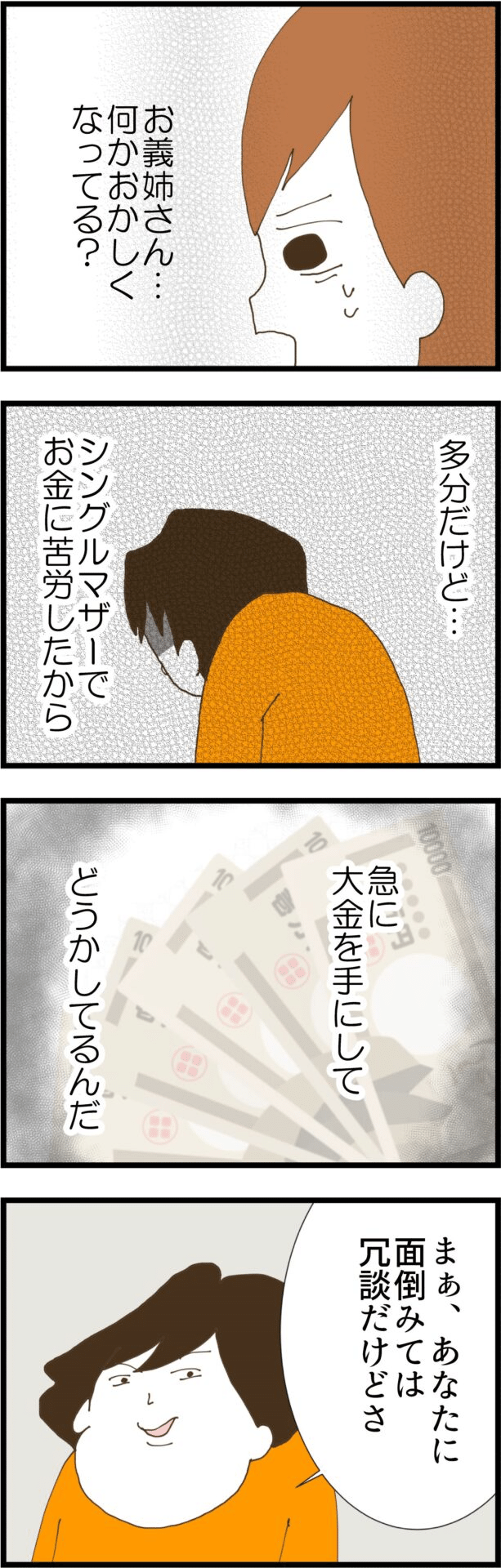 義姉はきっとこれまでお金で苦労したからこそ、突然大金を手にして正常な判断ができなくなっているのだと妻は考えます。