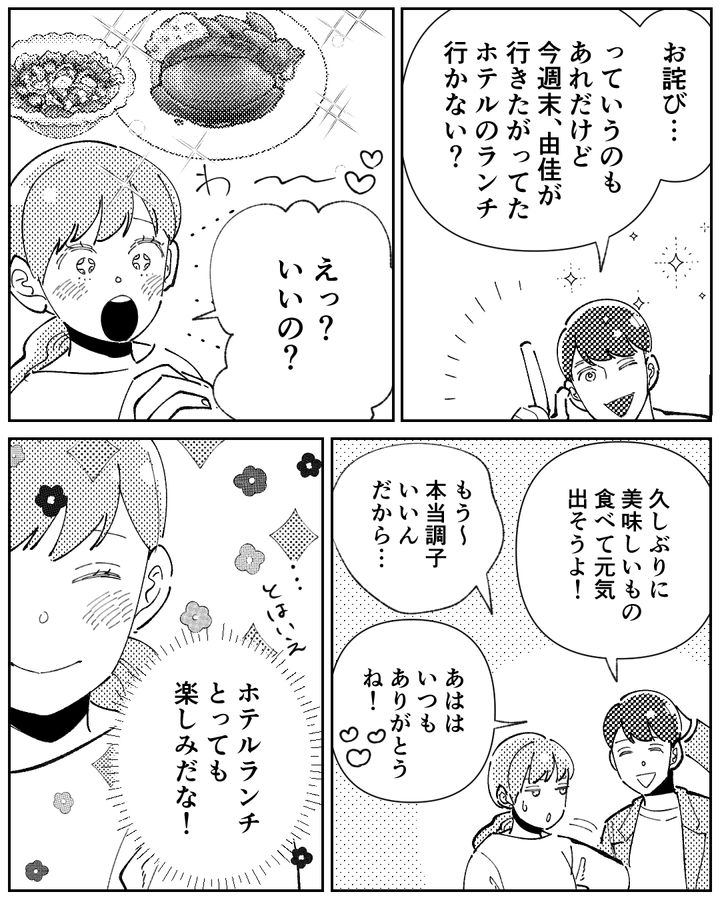 50代ながら華やかな義母は、妻に対してととてもフレンドリー。ただ、妻の結婚式にイブニングドレスで参列したり、娘のお宮参りにも派手な格好で現れるなど、常に主役になりたがりなところに妻はモヤモヤしていた。しかも、お宮参りでは、なぜか義母は妻が失くしたと思っていたパンプスを履いていた。夫に相談しても取り合ってもらえないある日、また義母が家にやって来る。そして、勝手に妻の化粧品を物色し、「これ欲しかったの」とストックを持って帰ろうとして!?