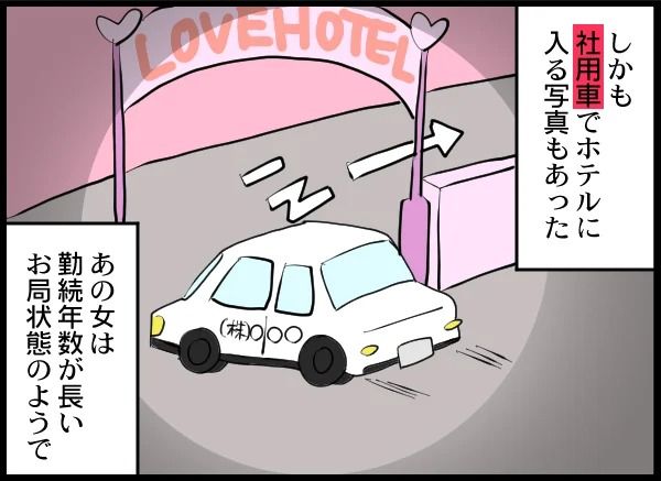 夫と相手女性は社用車を使って逢瀬を繰り返していました。証拠を送りつけられ、会社にバレたくない相手女性は、すぐに相場以上の慰謝料の支払いに応じます。