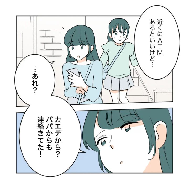 ミズキと一緒にレストランを出たところで、シズクはスマホを見て「カエデからもパパからも連絡きてた!」とミズキに言いました。