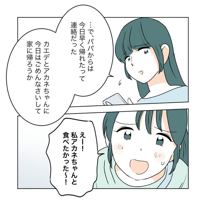 さらに「で、パパからは今日早く帰れたって連絡だった。カエデとアカネちゃんに今日はごめんなさいして家に帰ろうか。」と困ったようにミズキに言いました。もちろんミズキは「えー!私、アカネちゃんと食べたかった~!」と言いました。