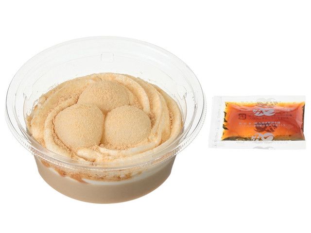 もっちり食感のきなこぷりんに団子とホイップクリームをトッピングし、お好みで濃厚な黒蜜をかけていただく仕立て。