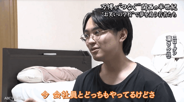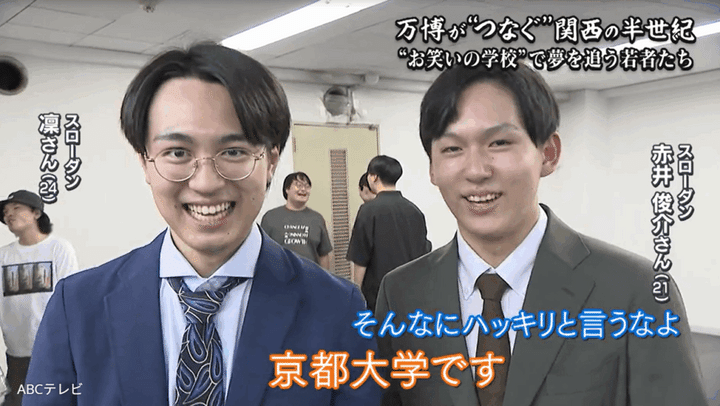 実はスローダンは、“ダブル京大漫才コンビ”だ。ツッコミ担当の赤井は京都大学の3年生で、ボケ担当の凛は2024年に同校を卒業し、翌年に広告代理店へ就職。超エリートな経歴の2人は、それぞれ学業または本職の傍ら養成所に通っている。