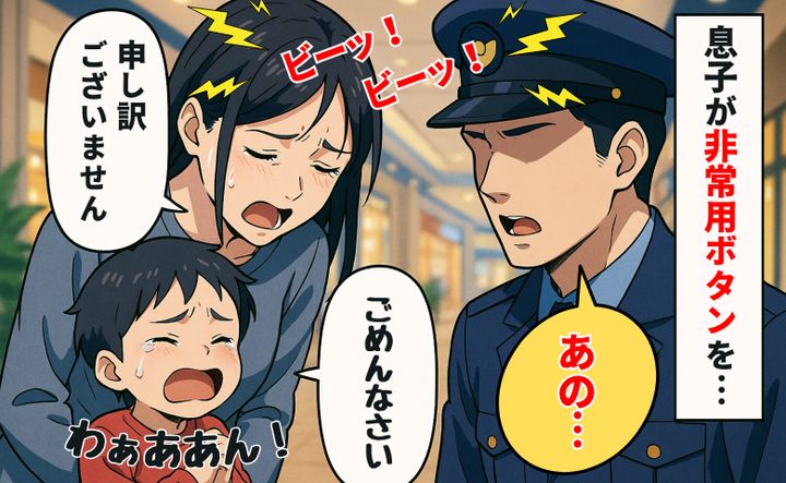 3. 息子が非常ボタンをポチッ…警報音が鳴り響く店内「すみません!」え?駆けつけた警備員さんに謝ると