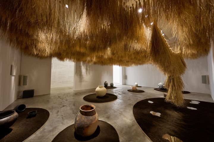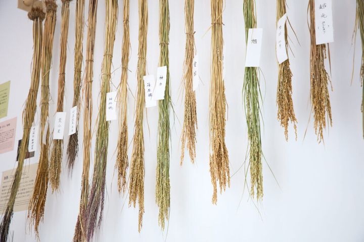 3000年以上前に日本に伝わり、時代の変遷とともに変化した稲の系統図をはじめ、豊作を祈るために作られたしめ縄、伝統技法と現代的な感性が融合した陶芸作品などが会場に並ぶ。 陶芸家・小野哲平さんや二階堂明弘さんなど、全国で活躍する作り手も参加し、「私たち(日本人)は、なぜお米を食べるのだろう?」という根源的な問いに立ち返った、一人ひとりの力強い言葉も展示されている。天井から吊るされた稲わら、足元に敷かれた土、空間に流れる自然音に囲まれ、現代にふさわしい「食」の在り方を一緒に考えてみたい。