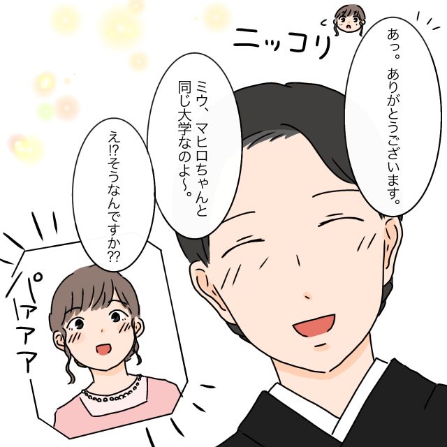 「あっ。ありがとうございます」とマヒロが言うと、「ミウ、マヒロちゃんと同じ大学なのよ~」とニッコリ。「え!?そうなんですか??」と突然の言葉に嬉しくなるマヒロ。