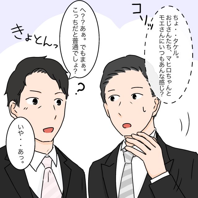 「ちょ・・タケル。おじさんたち、マヒロちゃんとモエさんにいつもあんな感じ?」セイジさんがコッソリそう言うと、「へ??あぁ。でもまぁ。こっちだと普通でしょ?」ときょとんとしているタケル。するとセイジさんが「いや・・あっ」