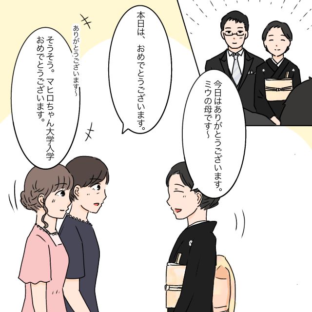 「今日はありがとうございます。ミウの母です~」と挨拶してくれた女性に、「本日は、おめでとうございます」と伝えると、「ありがとうございます~。そうそう。マヒロちゃん、大学入学おめでとうございます」とお祝いの言葉を伝えてくれ、
