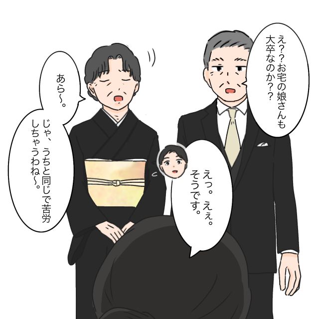 すると、「え??お宅の娘さんも大卒なのか?」と話に割り込む義父。「えっ。えぇ。そうです」と答えると、「あら~。じゃ、うちと同じで苦労しちゃうわね~」と義母まで言い出しました。