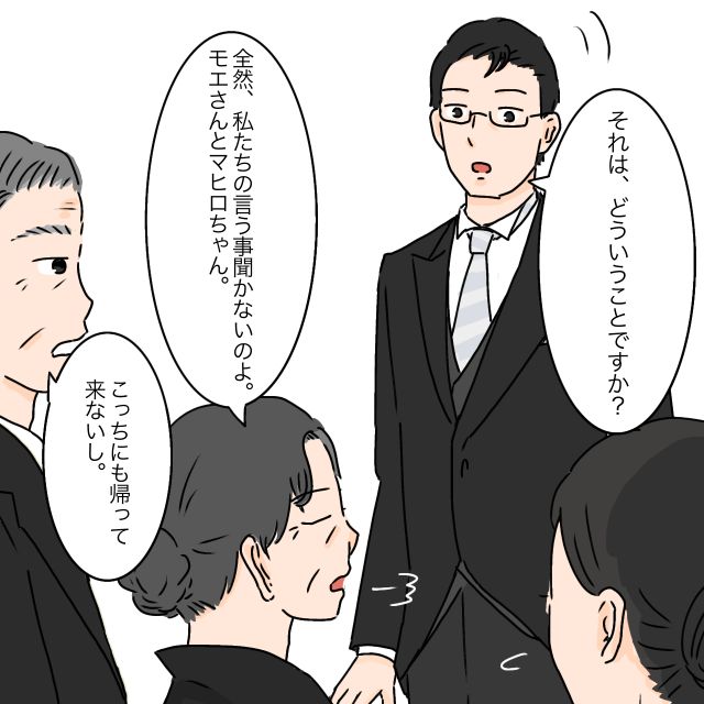 女性に学歴は必要ない、家のことは女性がやるものという男尊女卑の考えが強い義両親は、大学院卒で仕事もしているモエさんを良く思っておらず嫌味ばかり。夫のタケルさんもモエさんを庇うどころか義両親や自分を立ててと反発するモエさんを責めました。我慢できなくなったモエさんは絶縁宣言をして義実家に行かなくなりましたが、マヒロちゃんと話したい義母はよく電話をかけてきました。でもモエさんの悪口ばかり聞かされたマヒロちゃんは嫌な気持ちになり電話を敬遠するように。そんなある日、気が進まないながらもタケルさんに説得されて義実家へ行ったマヒロちゃんは、女の子だからとお手伝いをするよう言われたり、男の子のいとこばかりを優先する言動に傷つきます。さらに「おばあちゃんの言うことを聞け」と言うタケルさんを見て、「もうおばあちゃんの家に行きたくない」とマヒロちゃんが言うように。その後、タケルさんの親戚の結婚式で義実家へ行くことになったモエさんとマヒロちゃん。久しぶりに会った義母に早速嫌味を言われ応戦するモエさんに、感謝の気持ちを伝えるタケルさんのいとこセイジさん。「タケルは幸せだな~」と話していると、義父母があらわれてモエさんの文句をタラタラ。「親族だって認めてないわよ」「この結婚は失敗だったわ」」と言いたい放題の義父母の言葉をモエさんとマヒロちゃんは黙って聞いていました。