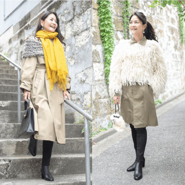 「ともすると春のフレッシュ感が際立ってしまうトレンチコートには、秋・冬ならではのふわふわな素材を合わせることで、季節感とともに上品さを加味できます」(桜井さん)。ファーとトレンチコートに馴染みやすいイエローのストールをレイヤードして、顔まわりが華やかに。視線を上に集中させることで、トレンチコートの重心も下がらずバランスのとれた着こなしに。