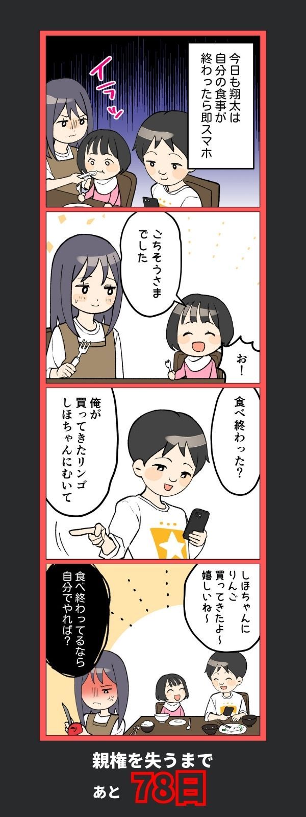 食事が終わると、さっさとスマホを手に取り、自分の世界へ入り込む夫。そんな夫の横で、娘の食事をサポートしながら後片付けまでこなす妻。そして娘が食べ終わった瞬間、夫からまさかの一言が飛び出します。