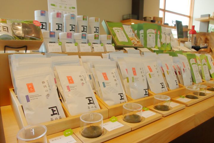 広々としたショップコーナーでは、佐々木製茶の屋号である「かねじょう」ブランドのさまざまなお茶を販売。