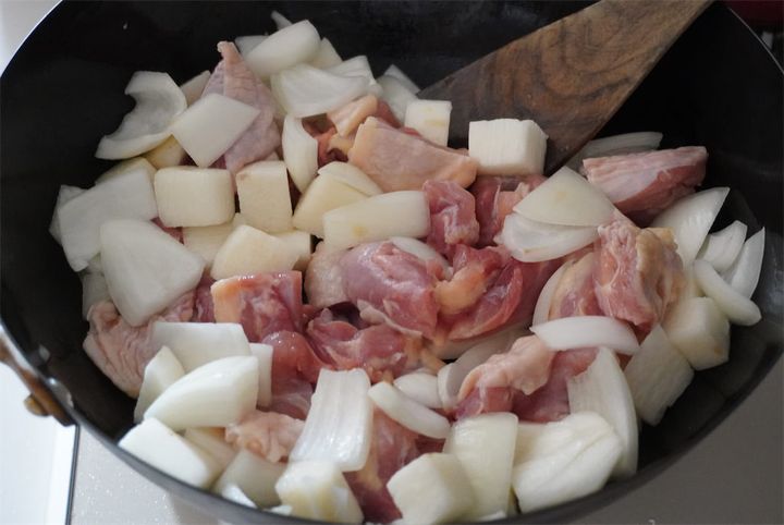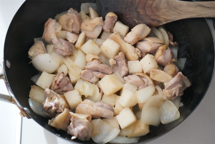 2. フライパンにサラダ油を熱して、長芋と玉ねぎを軽く炒めたら、鶏肉を加えて火を通す。