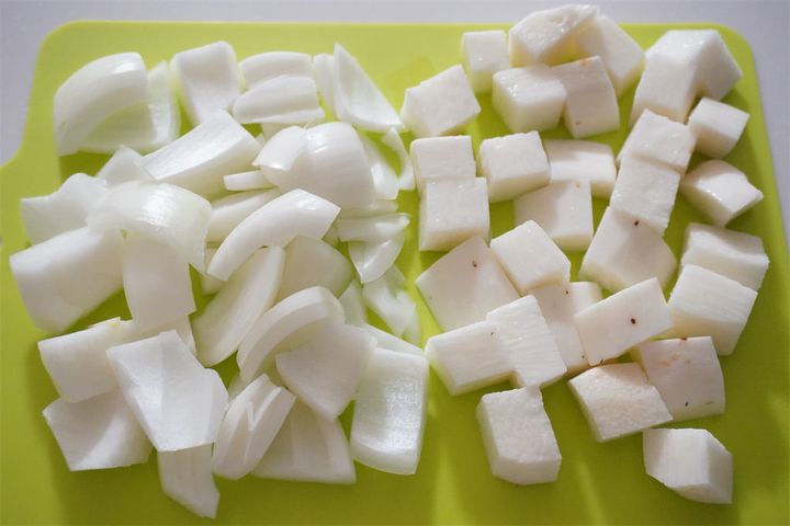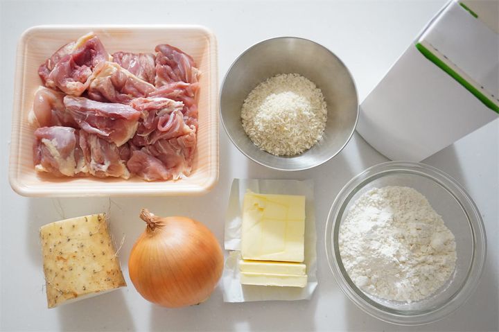 1. 長芋と玉ねぎは皮を剥いて2cm角、鶏もも肉は3~5cmほどのひと口大に切る。