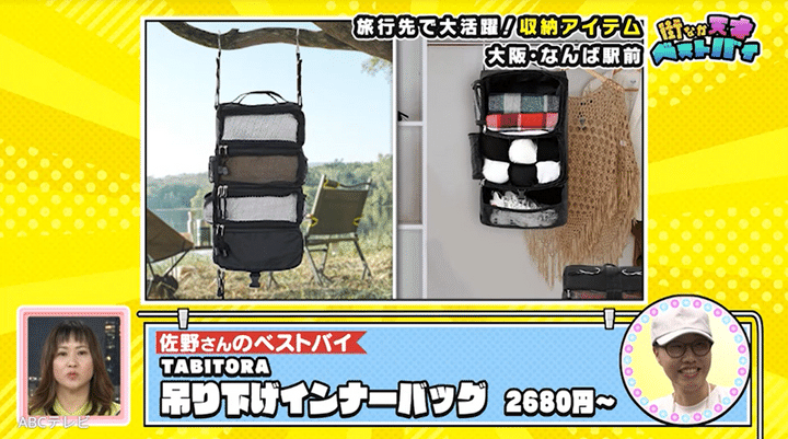 妹思いな姉のベストバイは、吊り下げ収納・TABITORA(タビトラ)。ますみも知っており、「スーツケースの中でもコンパクトに荷物を納められるし、そのままかけて、現地でいちいち(荷物を)出さなくてもいい」のだとか。“推し活遠征”はもちろん、キャンプや日常生活でも大活躍する便利アイテムです!