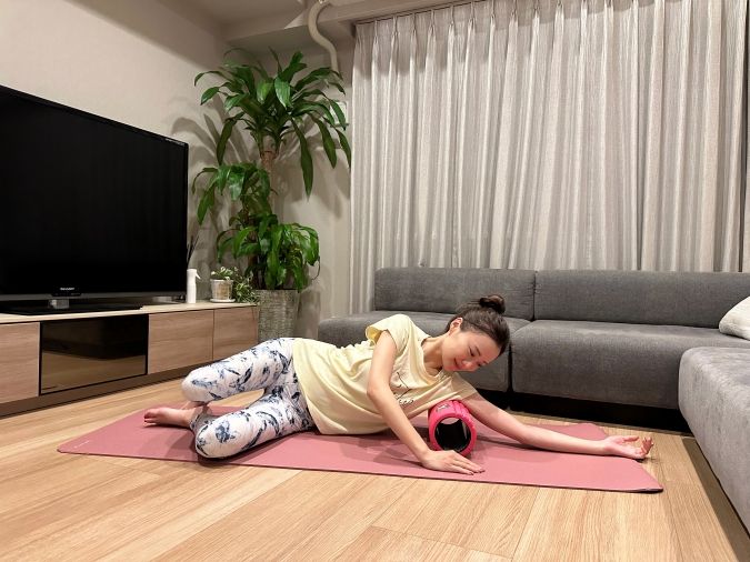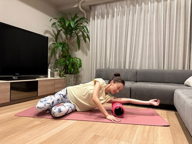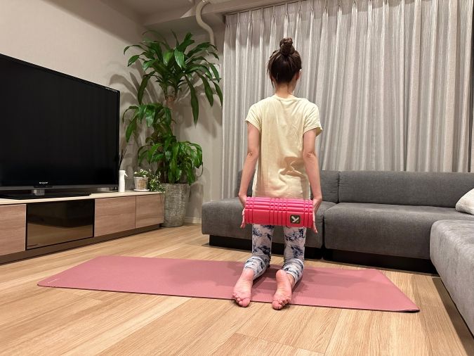 このとき首や肩に力が入りやすいので、上半身はリラックスして。ゴリゴリ転がすのではなく、ゆら〜っと動かすのが◎。