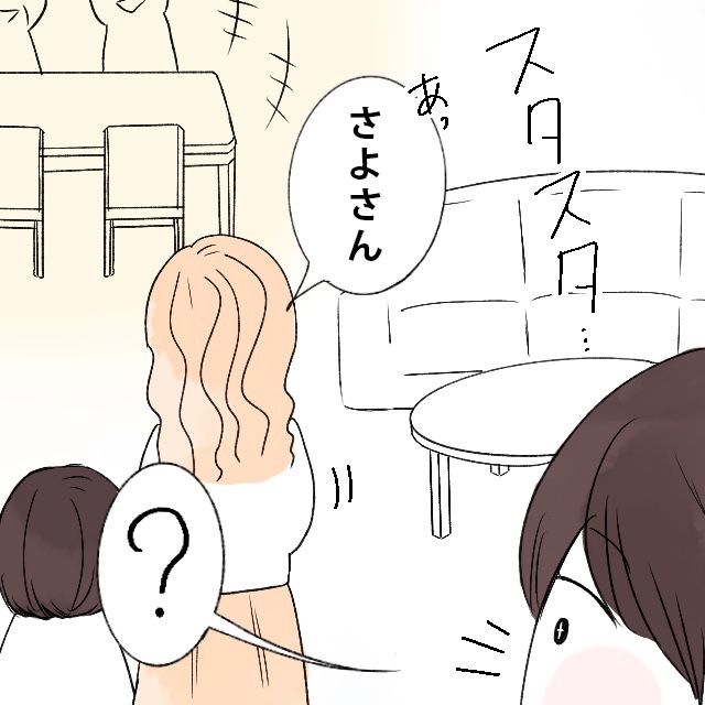 そしてダイニングのテーブルへ向かって歩く義母に、突然「あっさよさん」と呼ばれ、「?」何事かと思っていると、