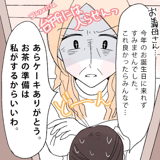 「お義母さん・・今年のお誕生日に来られずすみませんでした。これ良かったらみんなで・・」そう言ってケーキを差し出すと、「あらケーキありがとう。お茶の準備は私がするからいいわ」そう言ってキッチンを塞ぐように立ちはだかって言いました。