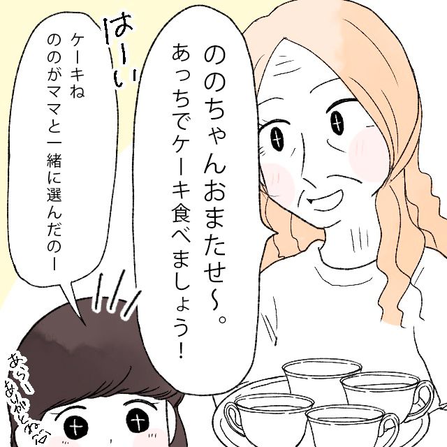 その後、「ののちゃんおまかせ~。あっちでケーキ食べましょう!」義母がののに声をかけると、「はーい!ケーキね、ののがママと一緒に選んだのー」と目を輝かせてののが言い、「あらーありがとね」と義母がお礼を言いました。