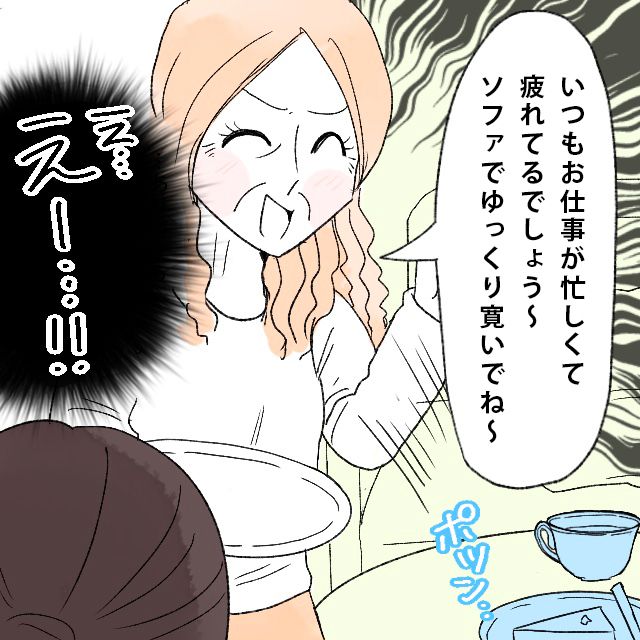 「いつもお仕事が忙しくて疲れてるでしょう~。ソファでゆっくり寛いでね~」と私の分のケーキとお茶をソファのテーブルに置いて言い、「え・・えー・・!!」と驚きました。