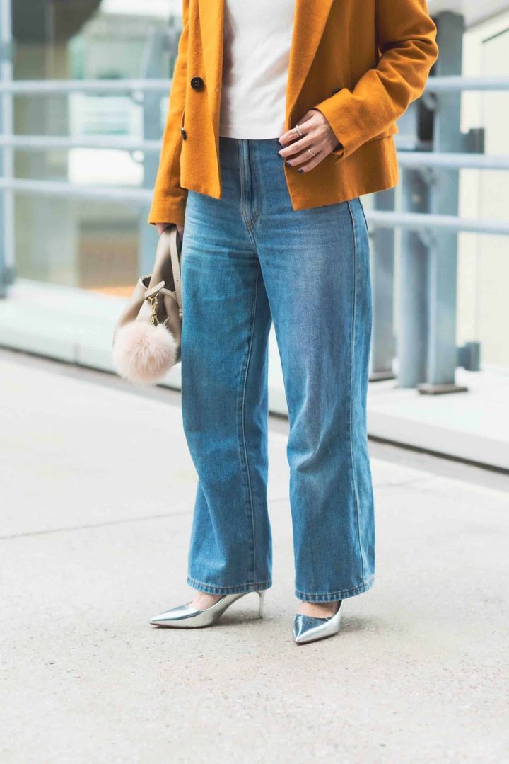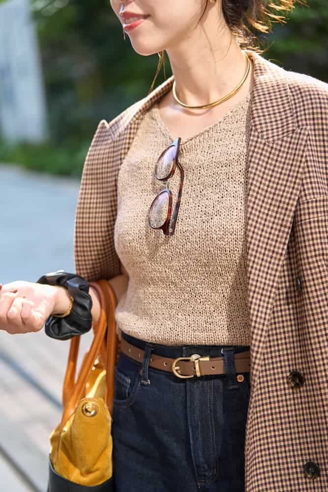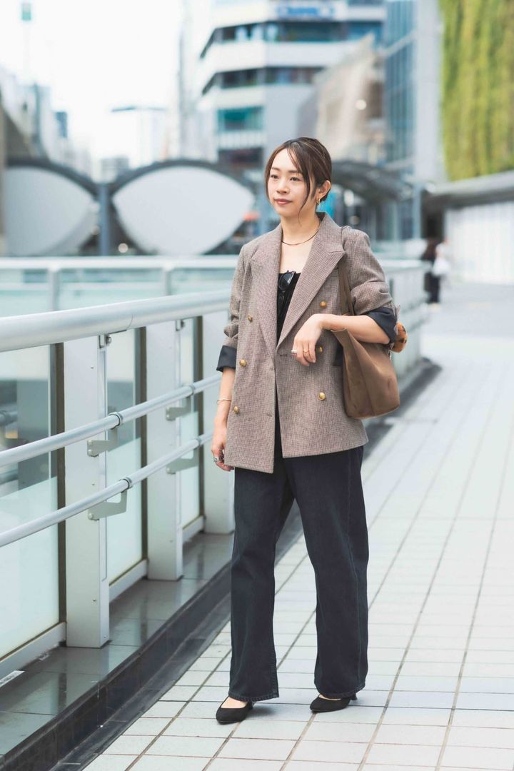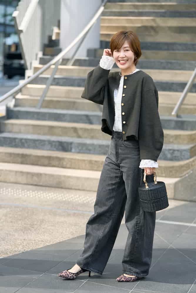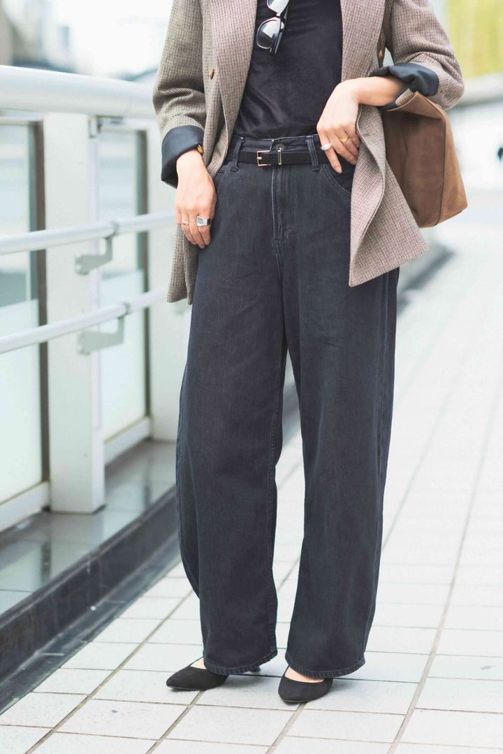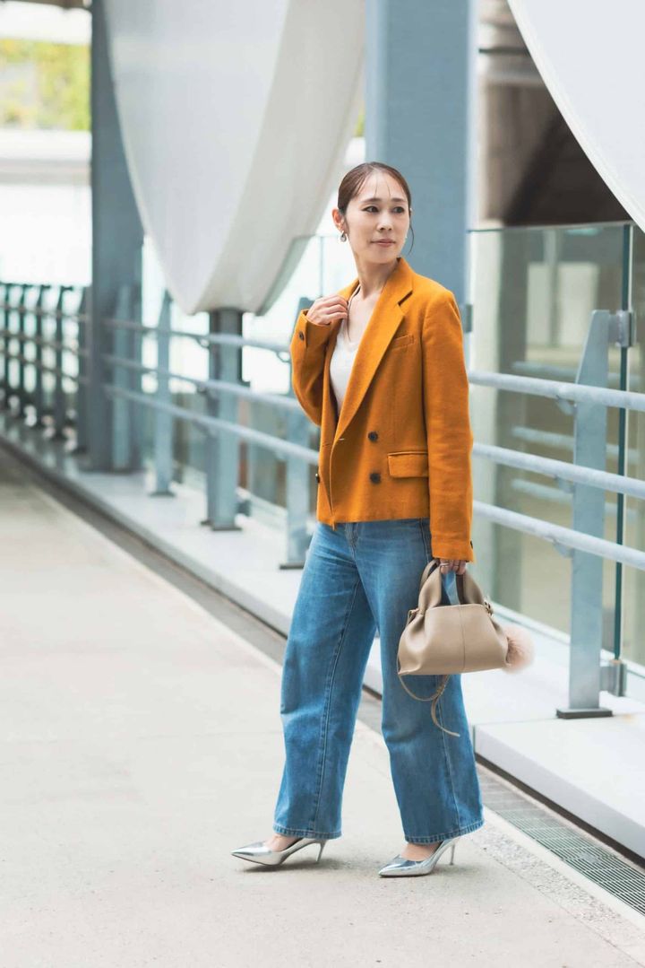 UNIQLOのデニムはシルエットや丈感がさまざまで万能なものが多いので、よくチェックしています。着用しているワイドストレートジーンズは、重すぎない見た目と履き心地に心を奪われて即購入。体型を拾わない絶妙なワイド感が気に入っています。デニムがややワイドなので、ジャケットはすっきりしたシルエットのものをチョイス。全体を秋カラーで落ち着かせ、ゴールドのジュエリーで華やかさを出しました。