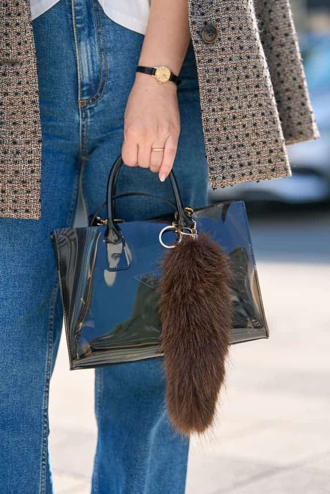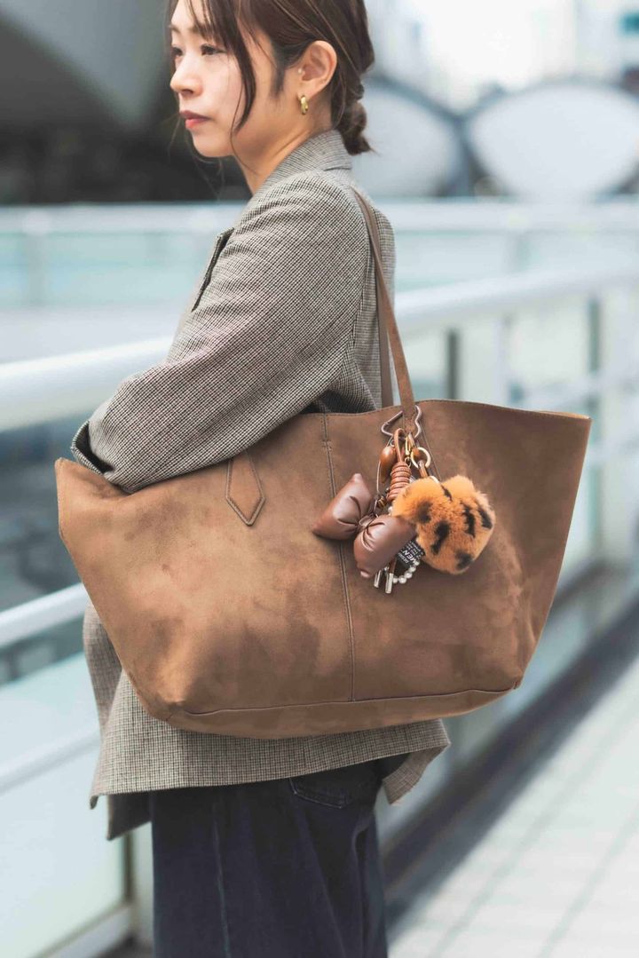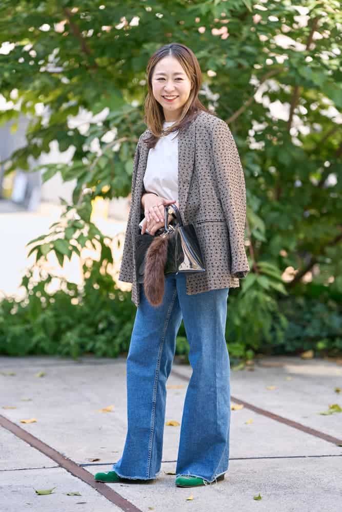 秋にぴったりな素材感の主役ジャケットには、明るい色のZARAのフレアデニムを合わせて抜け感を。ファーチャーム、グリーンのフラットシューズで季節感を添え、バッグはあえて透け感のあるものを選び重くなりすぎないように。それぞれのアイテムの色や素材を丁寧に選ぶことで、お気に入りのジャケットが引き立つコーディネートにしました。
