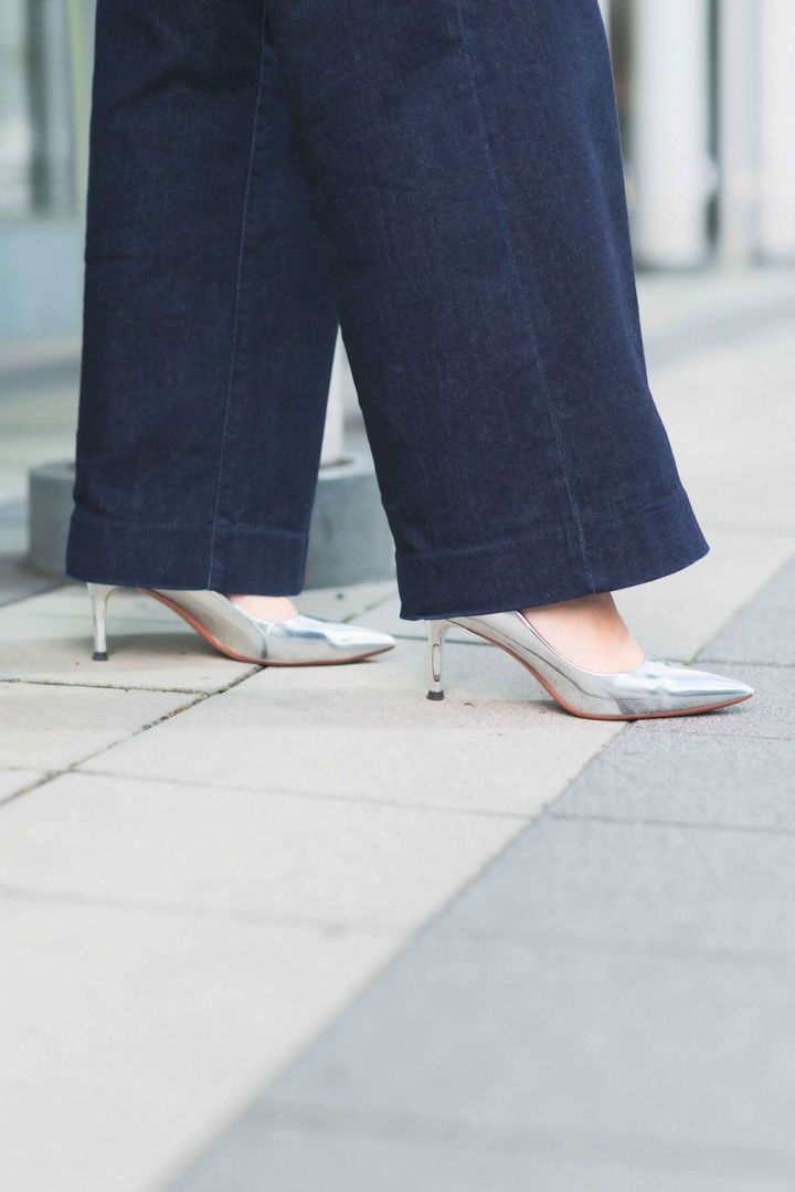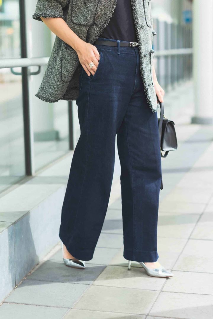 着られる時期が限られる半袖のツイードジャケットを、この季節ならではの主役アイテムに。濃色のワイドトラウザージーンズは脚のラインを拾わず、すっきりとしたシルエットで秋らしい雰囲気を演出します。シルバーのメタリックパンプスを合わせることで華やかさを添え、かっちりバッグをプラスして全体を引き締め。知的で上品な大人の秋コーデに仕上げました。