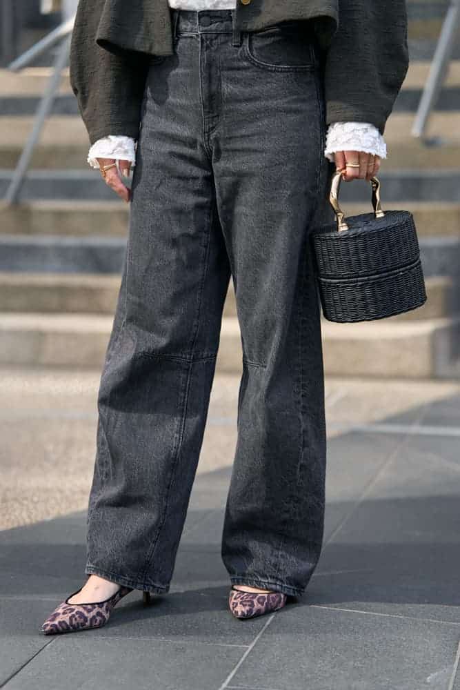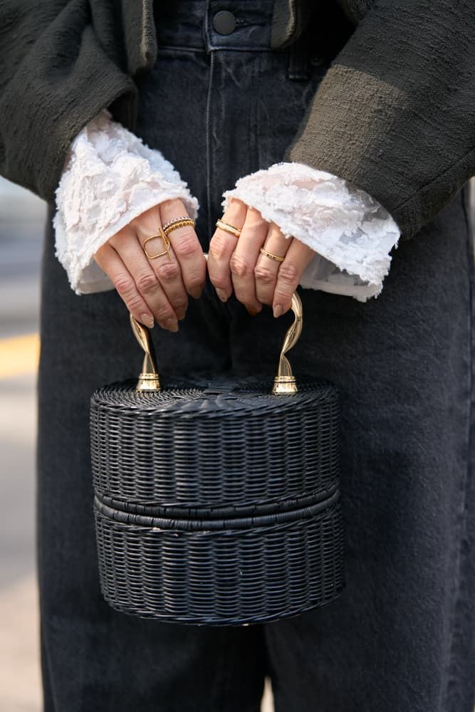 ハードになりがちな黒デニムには甘めのブラウスを合わせ、短丈ジャケットで脚長効果を意識しました。GUのバレルレッグジーンズは柔らかく腰まわりをカバーしてくれるので愛用中。仕上げはお気に入りのMANIMARISのパンケーキバスケットと、コツコツ集めているCHIEKO+のリングで華やぎをプラス。ripsalisの新入りリングも加えて、シンプルコーデに個性と女性らしさを添えました。