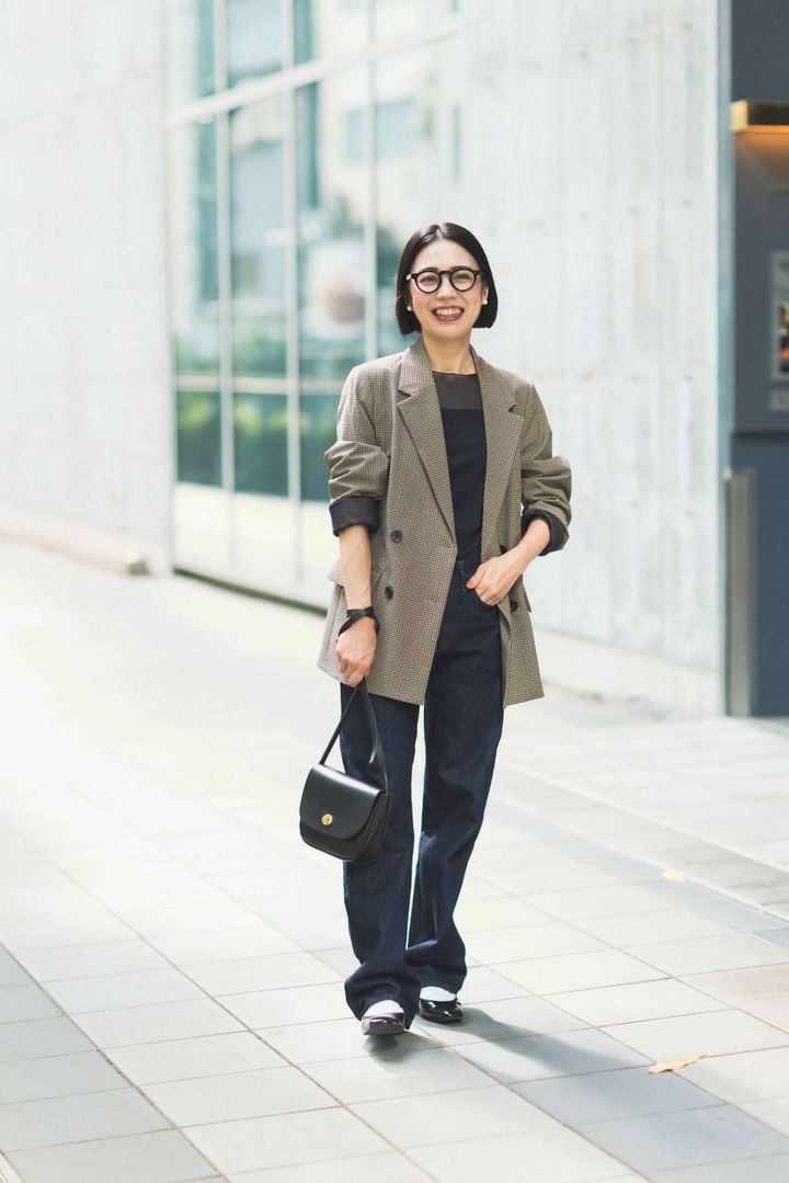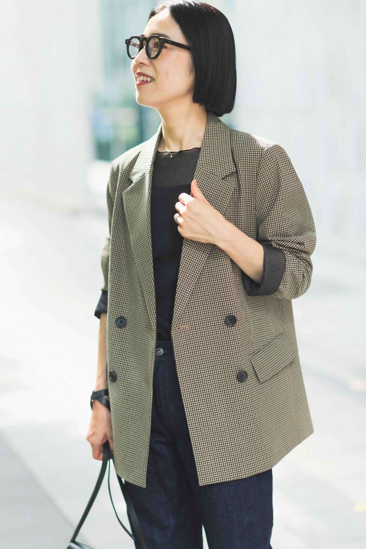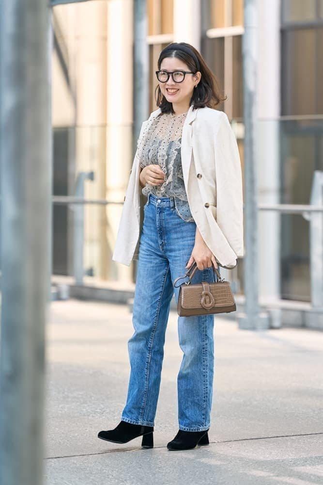 きちんと感のあるジャケットにデニムを合わせて程よくカジュアルダウン。UNIQLO ×JW ANDERSONのストレートジーンズは、裾をあえてたるませてローヒールに合わせることで、メンズライクな雰囲気を際立たせました。女性らしさのあるメリージェーンシューズとシアートップスをプラスしてバランス調整。めがねやバッグを黒で統一し、全体をシャープに引き締めてバランスよくまとめました。