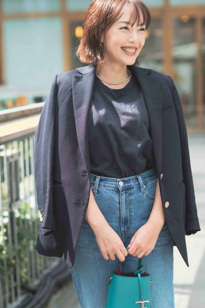 普段からきれいめな服が好きなので、デニムを着るときもエレガントさを忘れないスタイルが理想です。UNIQLOのデニムはカジュアルなアイテムなので、上質なネイビーのジャケットと小物で洗練されたエレガントさをプラス。全体の色味はネイビーやブルーに統一しつつ、秋空に映えるターコイズのミニバッグを差し色に効かせたのもポイントです。