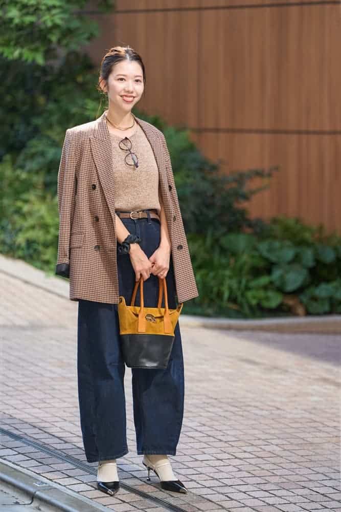 カーブシルエットが足首をキュッと引き締め、足長効果を期待できるバレルレッグジーンズ。ゆとりがあるので動きやすく、やんちゃ盛りの2歳の娘と遊ぶ時にも大活躍しています。今回はピンヒールのパンプスを合わせてきれいめにまとめました。トラッド感溢れるテーラードジャケットとリネンニットのトップスは、トレンドカラーのブラウンで統一。スエード素材のバッグを合わせれば秋らしさが一層深まります。