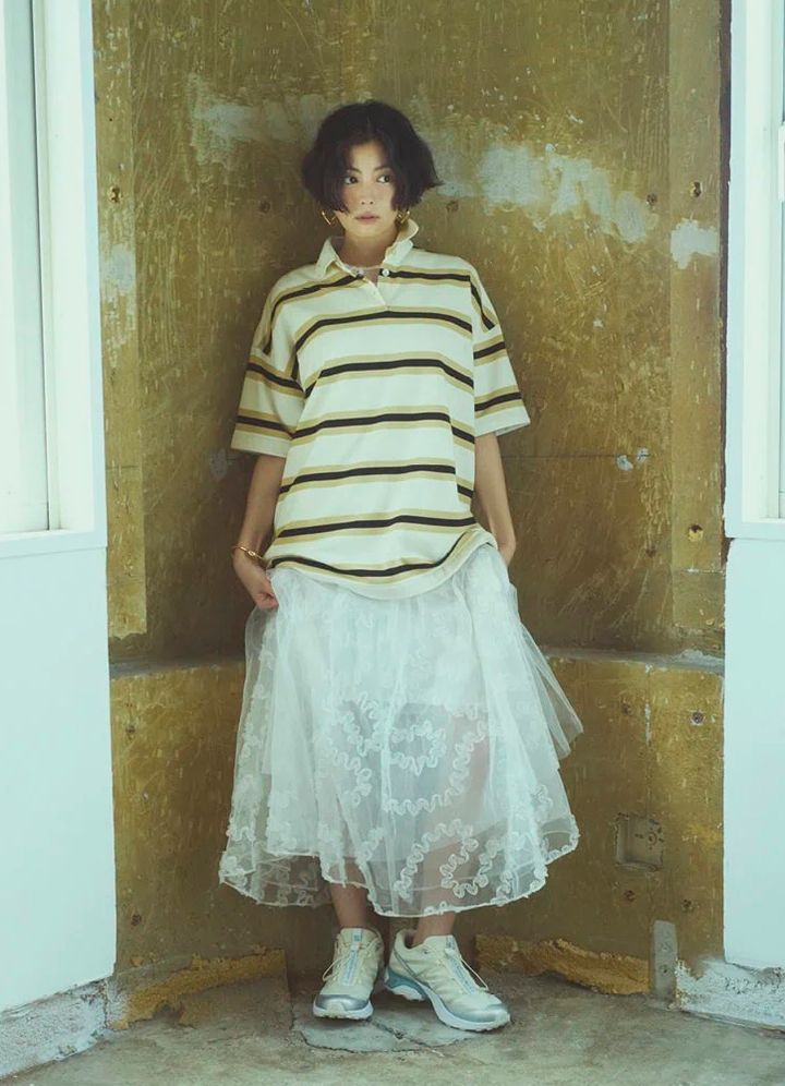 第3位はレディなレースドレスを使ったMIXスタイル。ピュアなムードあふれるホワイトレースのドレスは、そのままだと大人にはちょっぴり甘め。今季らしい大きめサイズのポロシャツをオーバードレスし、足元はボリュームスニーカーで甘さの引き算をするのがグッドバランスのカギ。ゴールドカラーのピアスで大人っぽさも忘れずに。