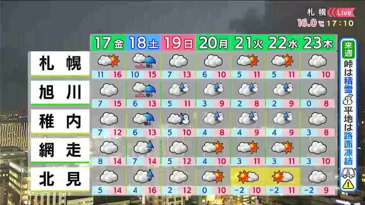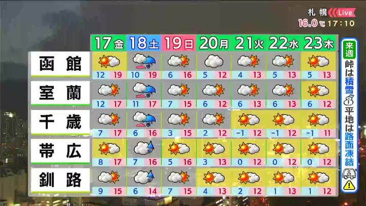 ※16日午後5時時点の情報です。最新の気象情報は、HBCウェザーセンターのホームページなどでご確認ください。HBCは気象庁の認可を2001年に得て以来、民間気象会社の一つとして「HBCの独自予報」を発信しています。
