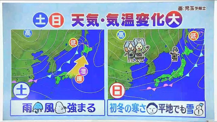 予想天気図で見ていきます。土曜日は北海道に近づく低気圧や前線に向かって南から暖かく湿った空気が流れ込み、雨や風が強まります。日曜は西高東低、いわゆる冬型の気圧配置に変わります。冬将軍の子どもが親元を離れて一人で北海道にやってくるため、「冬」とまではいきませんが、「初冬」の寒さになって、平地でも雪が降りそうです。雨や雪、寒さに対してどんな備えをしたらよいのか見ていきましょう。