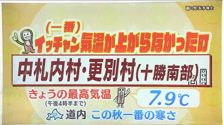 正解はこちら!イッチャン気温が上がらなかった町でした。きょう16日(木)は最高気温が7.9度にとどまりました。日中の気温として道内のこの秋一番の寒さになりました。