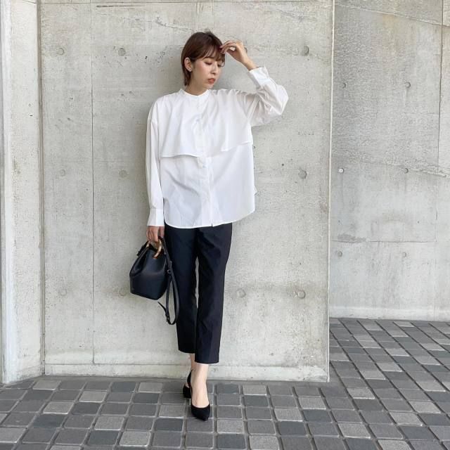 オフィスカジュアルの職場なら「映えデザインの白シャツ」を選んでみては。例えばケープデザイン・ボリューム袖・ペプラムなど可愛らしいデザインでも、白色のシャツブラウスであれば問題ありません。ベーシックな黒パンツを合わせると全体が引き締まり、通勤コーデに馴染みます。