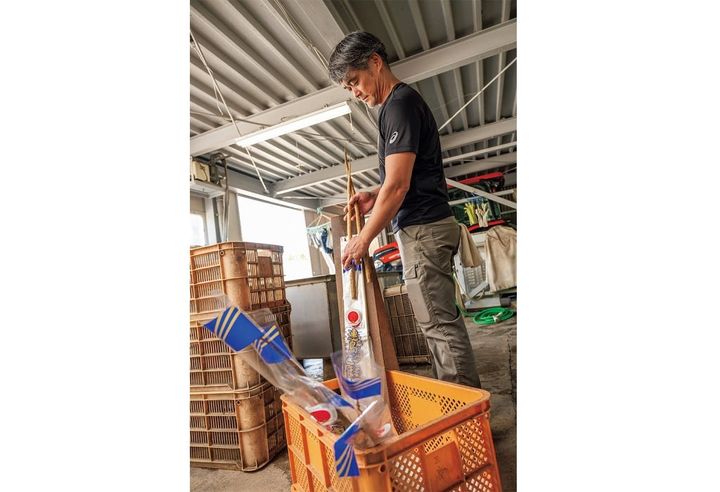 そのあと、サイズ別に分別し、一本ずつ袋詰めしたものを段ボール箱に詰め、JA連島集出荷場に運んで出荷する。