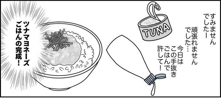 「は? 微熱じゃん……私だって横になりたい!」そう心の中でつぶやきながら、冷凍ご飯をレンジでチンしてツナマヨ丼を作りました。もう、それが精いっぱいでした。