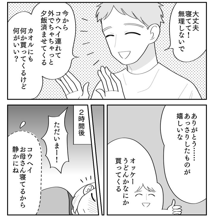 カオル(仮名)さんは夫のフウタ(仮名)、小学2年生の息子コウヘイ(仮名)の3人家族です。ある日、カオルさんは朝から熱を出してしまい、夕食を作る元気もありませんでした。そこでフウタさんにコウヘイ君を夕飯に連れて行ってもらい、「帰りにあっさりしたものを買ってきてほしい」とフウタさんに頼みました。