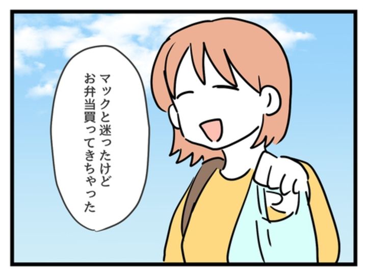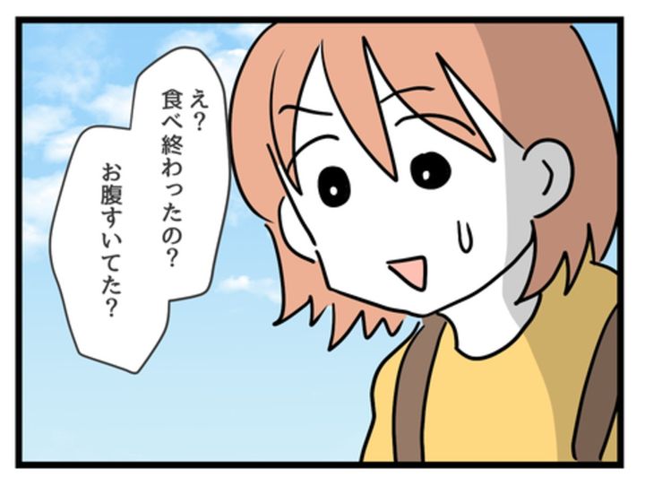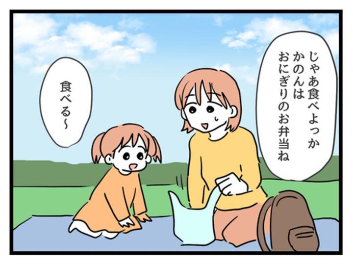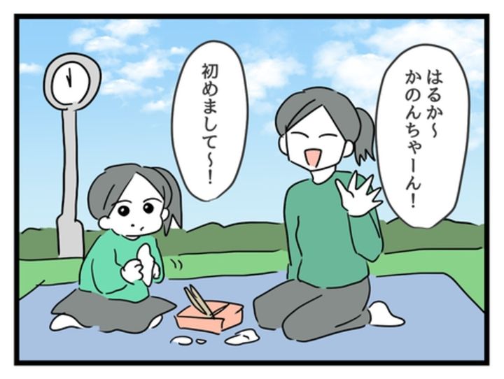 お昼の12時に、と約束をしていたはずの2人ですが、早めに着いたりさは娘のゆずきちゃんとすでにお弁当を食べてしまっていました。はるかは持参したお昼ご飯を娘と2人で食べることに…。どうして待ち合わせの時間まで待てなかったのか、理由もよく分からず、はるかは戸惑います。一方のりさは早めにお昼を食べていたことに悪気はなさそう。