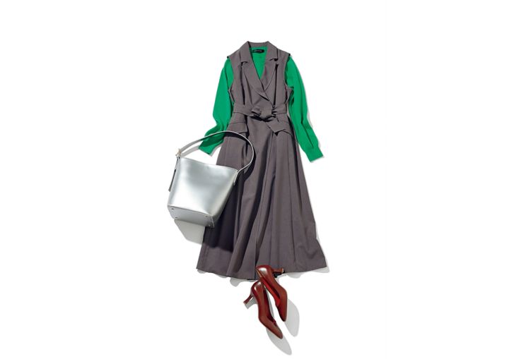 ジレワンピース¥25,300/イチエ(シュガー・マトリックス) カシミヤニット¥37,400/ルーニィ ブラウンパンプス¥19,250/ダイアナ(ダイアナ 銀座本店) シルバーショルダーバッグ¥11,000/アルテミス by ダイアナ(アルテミス by ダイアナ アーバンドック ららぽーと豊洲店)