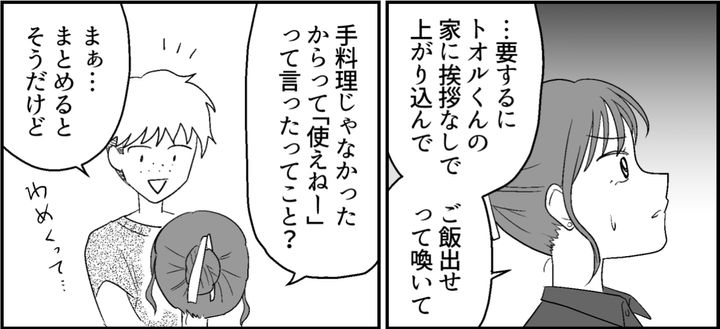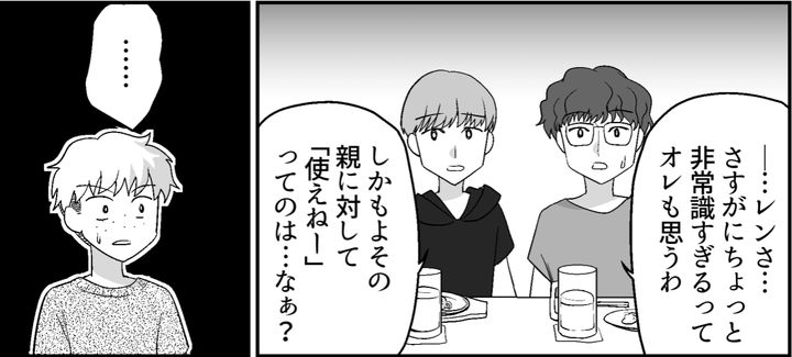オレは大学3年生のレン。サークルの飲み会で、この前トオルの家へ遊びに行ったときの話をぶっちゃけた。「夕飯どきなのにメシのひとつも出てこなかった」「出てきたと思ったらまさかのファミレスの宅配」オレはトオルの母親に受けた仕打ちを面白おかしく話してみた。だけどあんまりウケなかった。彼女はなぜか真面目な顔で質問をしてくる。オレが答えるにつれ、まわりが静かになっていく。まるでオレが何かとんでもないことを言っているみたいに……?