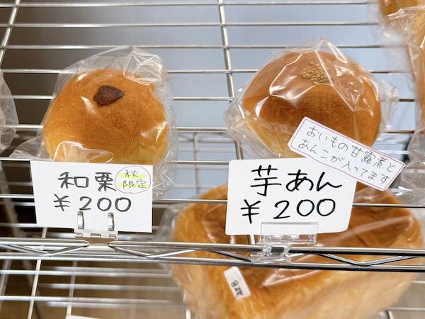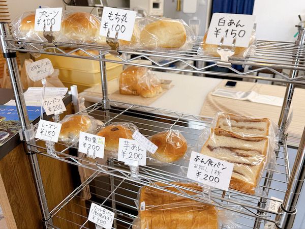 『糸島食ぱんや』では、食パンのほかに「丸パン」(100円〜)も販売されています。 プレーンをはじめ、白あん、レーズン、季節限定の和栗、芋あんなど、どれも手に取りたくなるラインナップ。棚には残りわずか、こちらも早い時間に次々と売れたそうです。