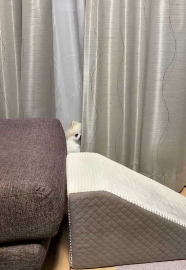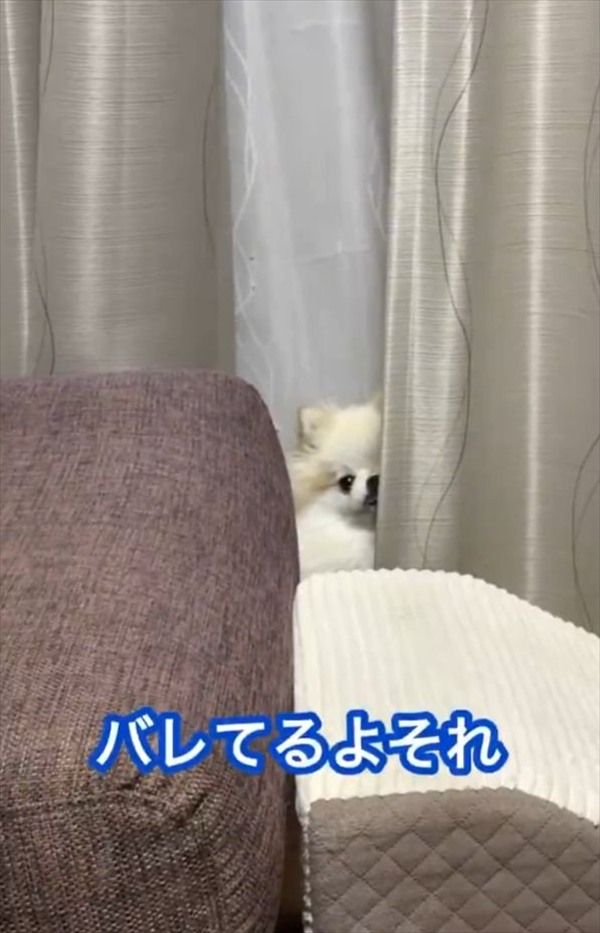 隠れてるつもり?カーテンの裏に身を潜めるもバレバレなポメラニアン